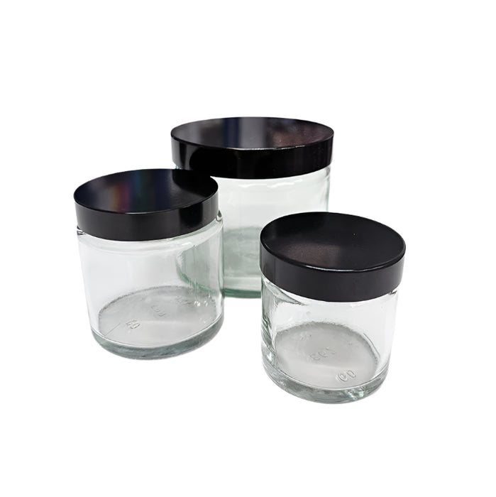 Glass jars with screw top, available in various sizes.